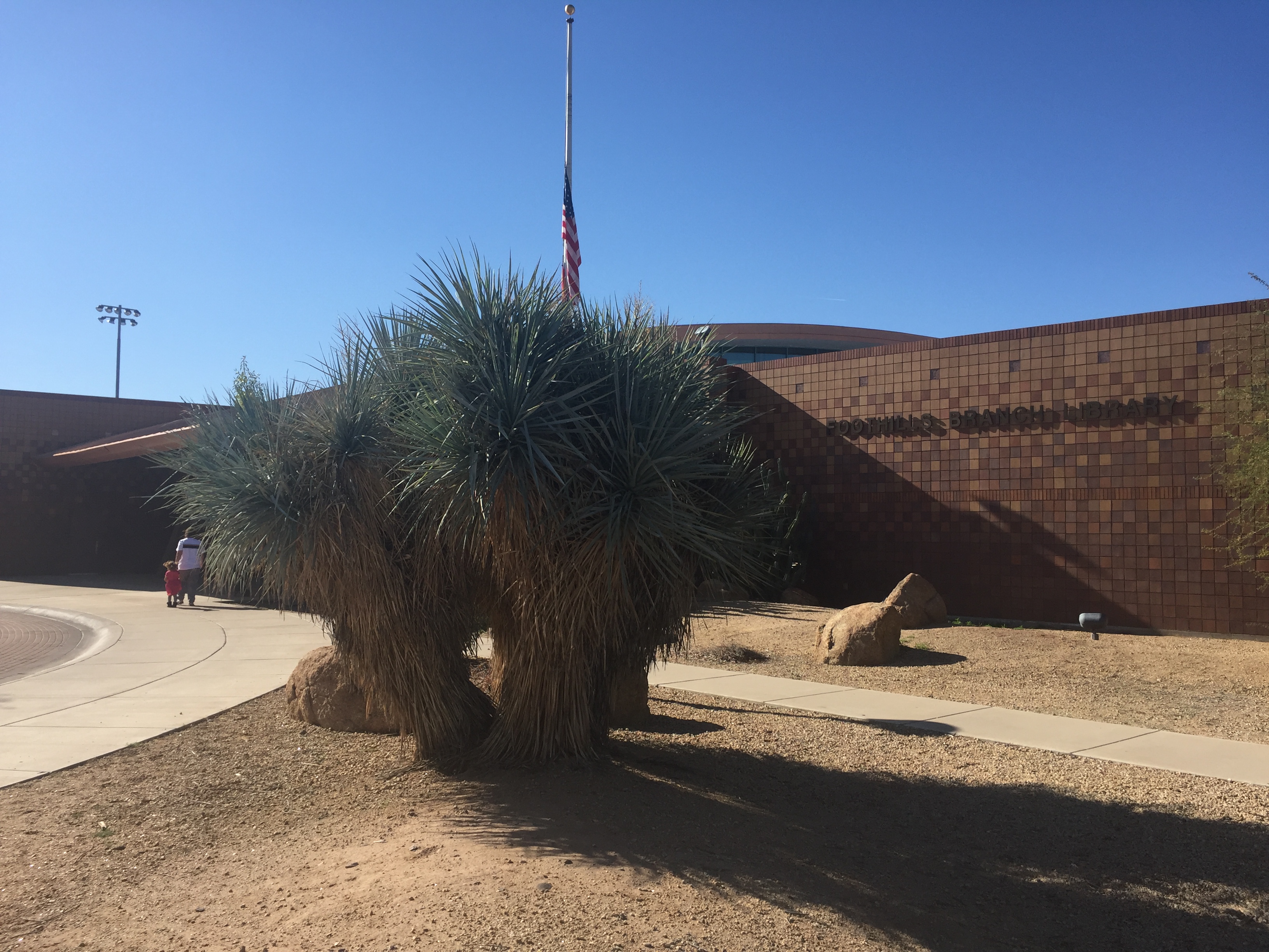 My hometown, San Antonio, has a colorful Chihuly hanging in a large atrium on the second level of the main library downtown. This library was the appropriately my first library blog years ago. (Photo below from San Antonio – a very colorful hanging Chihuly.) But the Chihuly in Arizona is impossible to miss. Everyone entering the library’s main entrance crosses right under it.