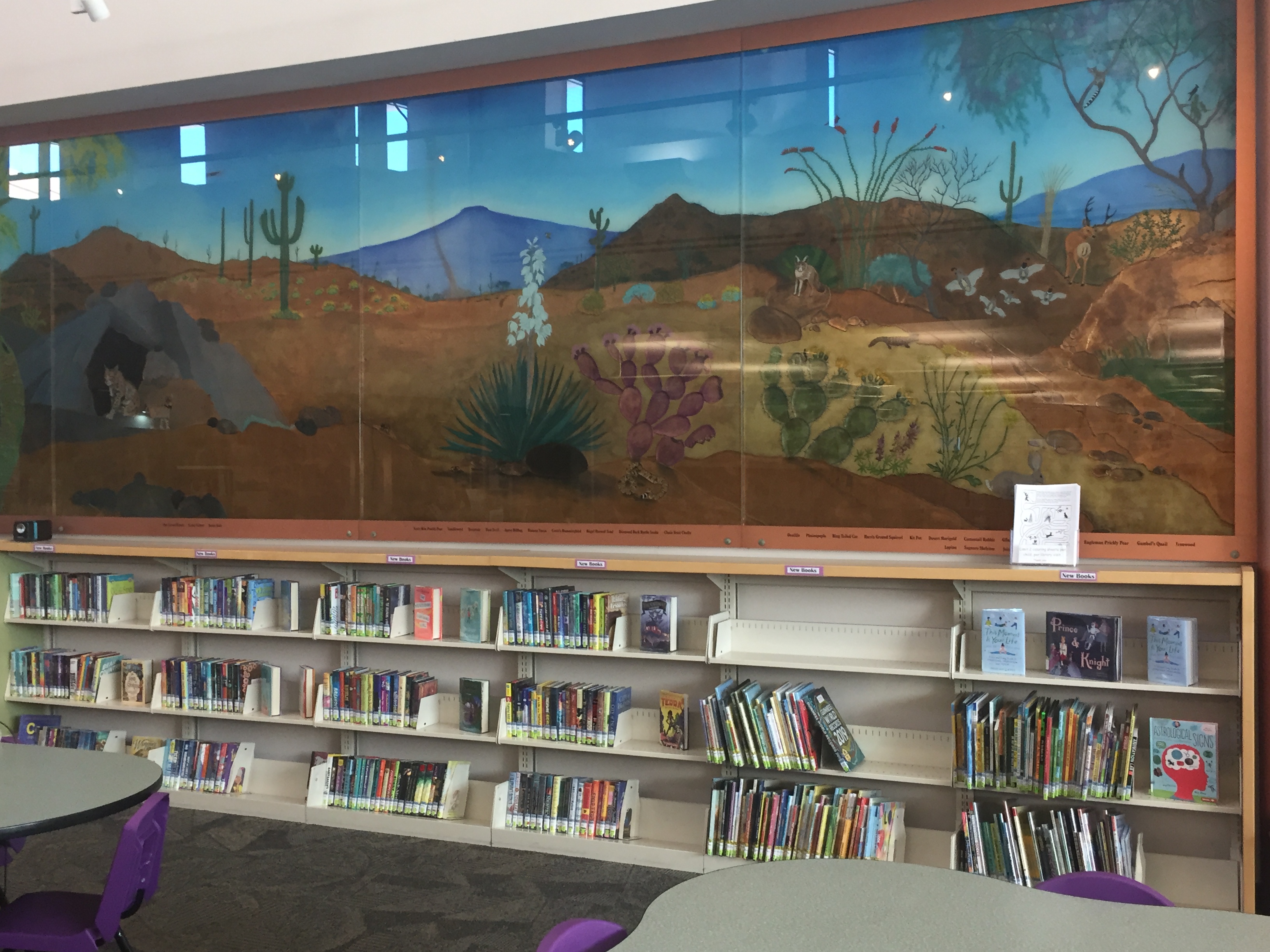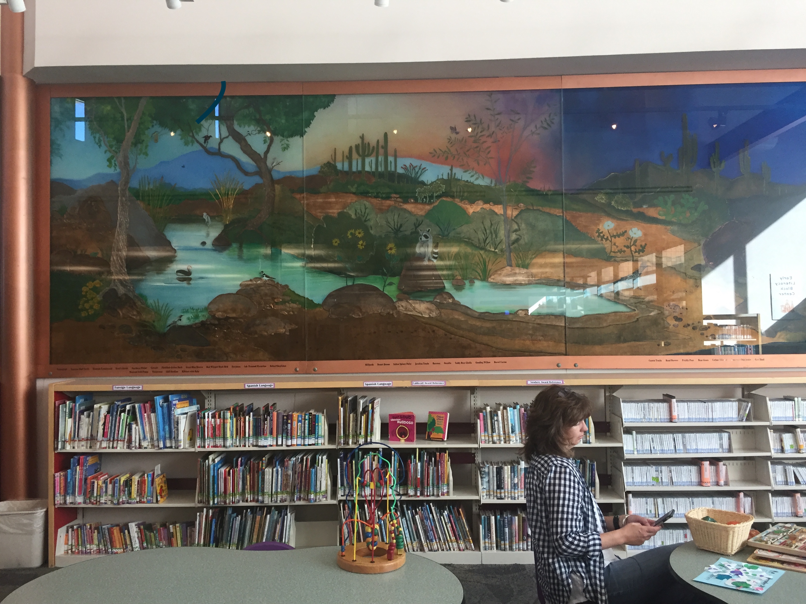 And this library also has a very special glass mural. Thirteen glass panels portray “Twenty-four Hours in the Sonoran Desert.” A local Arizona artist, Melissa Paxton, created these panels that start at midnight and depict a single 24 hours, a day and night in the desert, with native plants and animals. Panels are dark, light, or somewhere in between as the day or night wear on. Unfortunately, they were difficult to photograph with the glare from the window and the dark panels didn’t show up well.