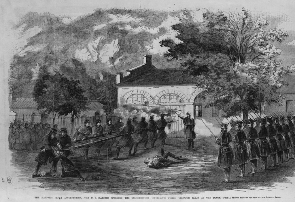 John Brown and his supporters hoped to start a rebellion by arming slaves and forcing slave-owners to end this inhumane practice. Only two federal arsenals manufacturing weapons existed – in Harpers Ferry and a town in Massachusetts. John Brown’s determined band, who must have known the odds against them, included three free black men, one freed slave, and one fugitive slave.